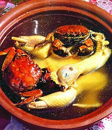 潮汕赤蟹:此蟹即潮汕膏蟹,学名叫锯缘青蟹,为广东潮汕的著名海产。膏蟹就是卵巢最丰满的雌蟹;已受精但卵巢不太饱满的雌蟹称“母”:略微饱满的叫“花蟹”;而雄蟹只供炒用,与未受精的母蟹统称“肉蟹”。捕自海中的雌蟹,卵巢饱满的不多,要进行人工育肥,使之成为“膏蟹”。养殖好的膏蟹,腿粗肉满,膏满脂丰,清蒸之后,鲜美异常,营养价值甚高。