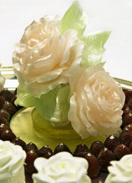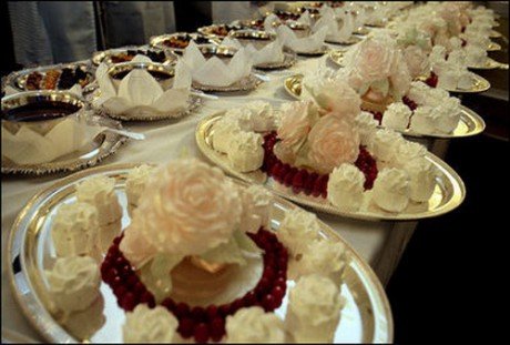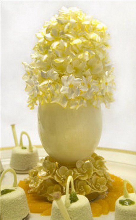 “春园”——美国对来访的外国元首欢迎仪式后午宴甜品,外形是一个大花瓶和四个洒水的小水壶。花盆是用巧克力覆盆子酥皮制作,小水壶是由小冰糕制成。花瓣则是白巧克力精心处理而成。