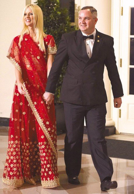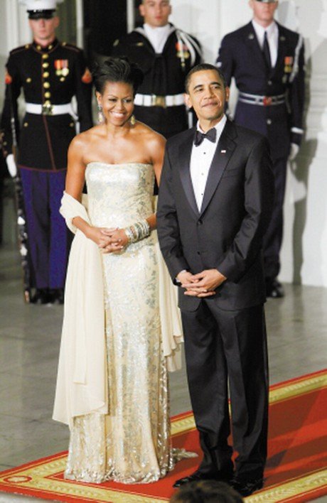 在2009年欢迎印度总理辛格的国宴上,米歇尔·奥巴马身穿由印度裔设计师纳伊姆汗设计的晚礼服华丽登场。当晚,她身着米色晚礼服、点缀闪亮银片,举手投足尽显女主人风范。媒体大赞米歇尔此次搭配完美,手腕上同色系的手镯以及一对耳环的选择都很有用心。