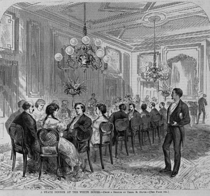 根据现代定义,美国首次国宴是在1874年举行的,尤里西斯·格兰特总统和夫人设宴款待桑威奇群岛国王戴维·卡拉卡瓦。桑威奇群岛的疆域包括了夏威夷。夏威夷后成为美国的第50个州。