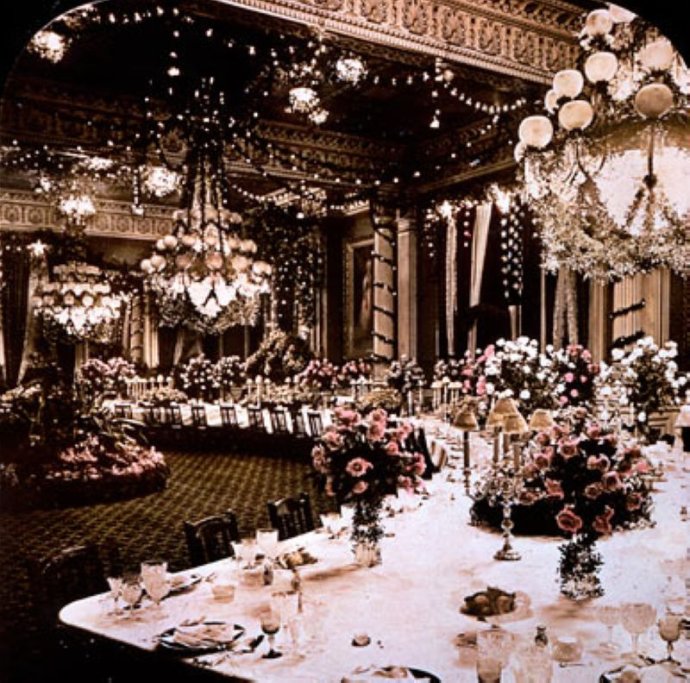 照片上的长长的宴会桌是1902年美国总统设宴款待普鲁士王子亨利时布置的,多年来,这种布置已成为标准。在整个宴会厅布置圆形餐桌的做法始于杰奎琳·肯尼迪。这种安排使得宴会厅可容纳更多的客人——约120至130位,同时能让主人打破正式座位安排的严格限制。