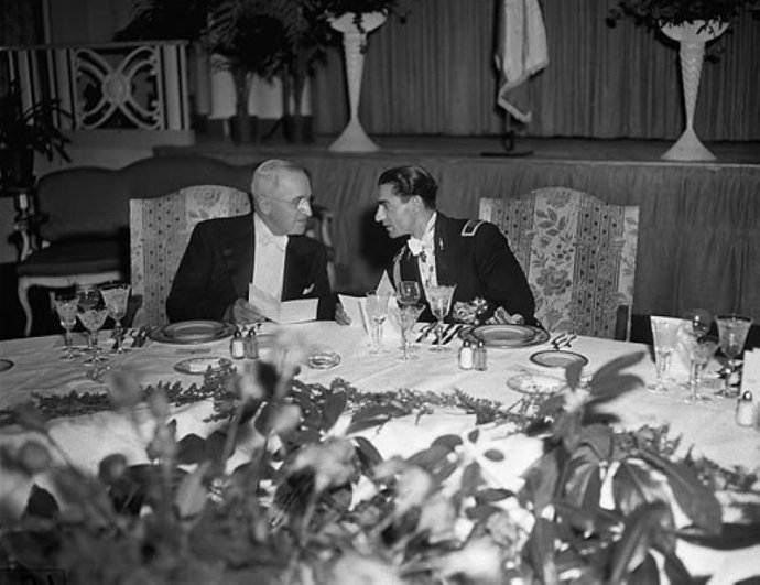 杜鲁门执政时期,白宫正在进行大规模整修,国宴便安排在外国元首下榻的酒店举行。这张照片摄于1949年,显示杜鲁门总统亲自来到伊朗国王下榻的索尔海姆酒店(Shoreham Hotel),设宴表示欢迎。