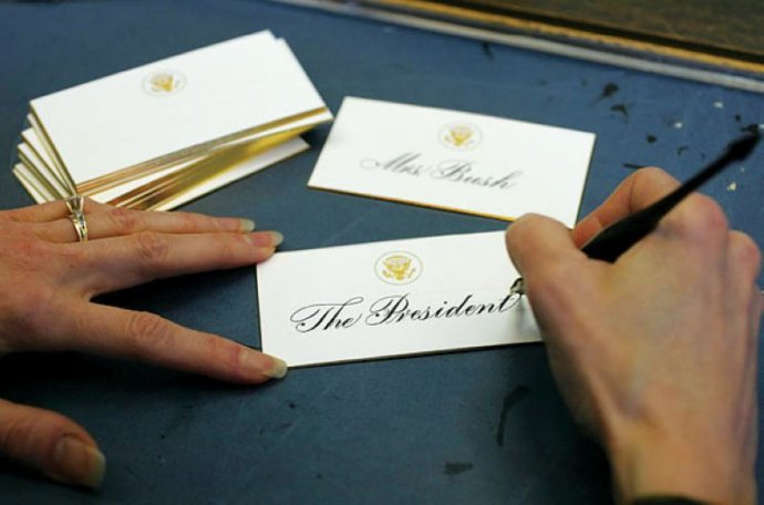 2007年,小布什设宴款待英国女王伊丽莎白二世。此图是伊丽莎白二世餐桌上的菜单。前白宫御厨沃尔特·沙伊布曾经说过:“国宴与其说是宴会,倒不如是说一台百老汇歌剧。公众会密切注视奥巴马夫人的个人风格。”