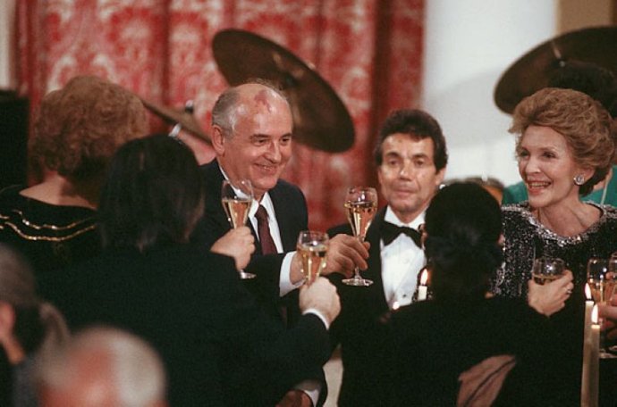 国宴上最引人注目的一个瞬间就是敬酒,两国领导人会借机谈一谈重要话题,通常会涉及重要的外交访问。在这张摄于1987年的照片中,苏联领导人在里根夫妇主持的宴会上向其敬酒。