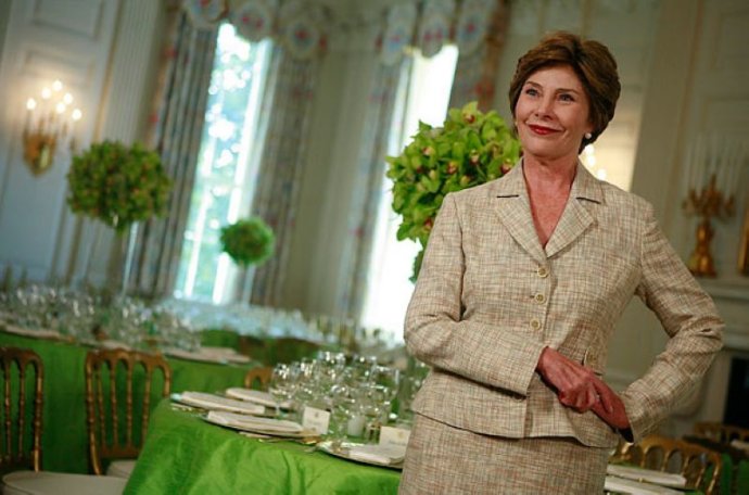 虽然国宴部分礼仪由美国国务院官员负责,但很多重要细节,如贵宾名单、菜肴、餐桌布置等,均由美国“第一夫人”及助手具体操办。这张照片中,小布什夫人劳拉·布什在欢迎日本首相的国宴举行前,在宴会厅做准备。