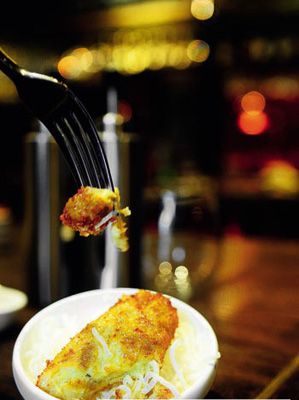 以银鱼、番茄及青口贝为主料,裹以面包、糖及杏仁粉,用明火炉制而成。