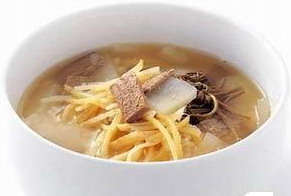 (1)萝卜切成薄四角形与海带一起炖汤。海带捞取切成四角形。切萝卜条炒后以酱油和盐调味﹐并与饭协调。准备肉汤﹑鱼汤﹑菜汤等3汤与饭一起端上桌或把这3种汤混在一起做杂汤。
