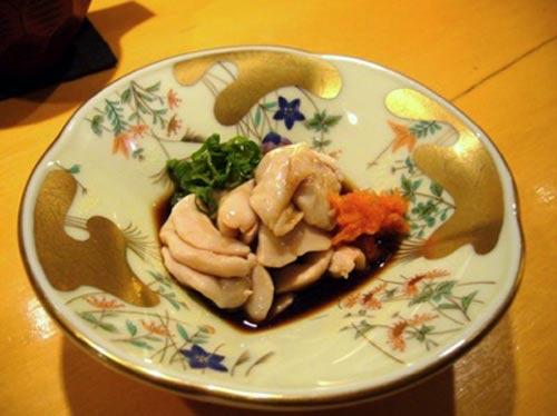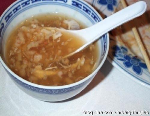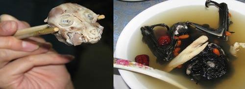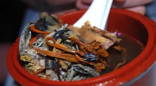 非常类似于我们传统的鸡肉汤,除了用鸡睾丸代替鸡肉,这汤只是由睾丸和蔬菜一起炖出来的。睾丸里面长有大量脂肪,非常柔软,类似于豆腐。睾丸据说对皮肤有很好的保养作用,还可以提高男人的耐力。