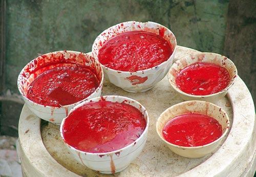 血汤,在越南是一种传统的汤菜,和我们传统意义上的汤不太一样,由鸭血、煮熟的鸭子、配以花生和草本植物制作出来的。血汤是被放在冷藏柜里,所以,拿出食用时血是凝固住了的,那里的人民坚信血汤能给人无尽的力量。自从东南亚流行禽流感以后,许多人不再喝血汤了。