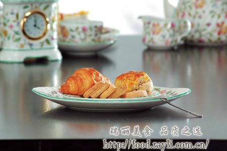 下午茶中的特色点心Scone、手工饼干、牛角面包等都是英国下午茶中特有的不可或缺的点心,维多利亚时代这些点心都是由手工制成,现烤现吃,热的时候味道更好。