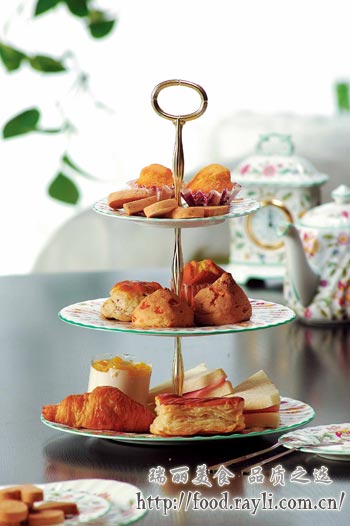 最下面一层可以放一些有夹心的味道比较重的咸点心,如三明治、牛角面包等;第二层放的是咸甜结合的点心,一般没有夹心,如英式Scone松饼和培根卷等传统点心;第三层则放蛋糕及水果塔,以及几种小甜品。