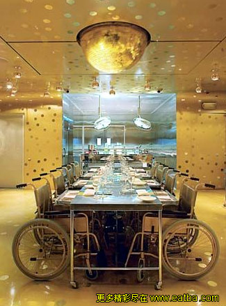 这是一个非常挑战食欲的餐厅。通常的餐厅都是精美的设计、暖暖的灯光,而新加坡的这家医院餐厅则并非这样。餐厅所有格局都是按照医院来打造,餐具更是非常专业:手术盘是餐碟,用玻璃试管装饮料,用餐的椅子是轮椅,当然,头上的灯肯定是手术灯。当你在这样的环境中用手术刀切开你想吃的牛扒时会有什么感觉?