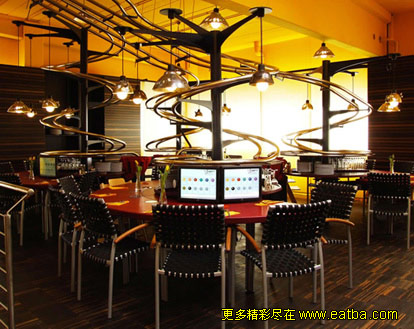这是一家没有服务生的餐厅,而且厨房设在天花板上。每张餐桌上都是机械装置和电脑屏幕。顾客按照语音提示,通过餐桌上的一个电脑触摸屏幕点菜。厨师做好菜之后,一节小车就会装着食物开出来,顺着螺旋状轨道“空降”到餐桌上,而饮料或者啤酒也顺着这个轨道流进餐桌边的容器中。