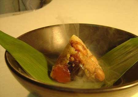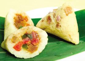 糯米750克、青梅、菠萝肉、冬瓜条各25克,西瓜子仁、核桃仁、葡萄干、红丝各15克,白砂糖300克。先将青梅、菠萝肉、冬瓜条各用白糖水煮,沥干水分,然后用白糖腌渍24小时,即成馅。包成五角方底粽,煮50分钟,离火焖4分钟即成。