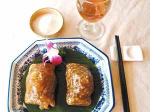 5、粽叶2片重迭,卷成尖桶状,放入2大匙做法(4)之三宝米,再放入1小匙碎萝卜干、香菇丁、栗子、素蛋黄、素肉松,再放1大匙三宝米,稍压一下,包成粽状,用棉绳捆紧。