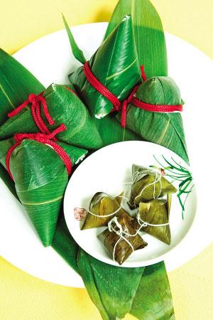 洗净粽叶及粽绳,取2张粽叶,在三分之一处折成漏斗状,在漏斗中舀入一半糯米,放入猪肉、香菇、咸蛋黄等馅料,再加上糯米填满,接着将多余的粽叶折回盖住漏斗包裹好,用绳子在粽腰处扎紧打结,做好后放入锅中,以水盖过粽子,用中火煮1小时左右,熟透了便可食用。