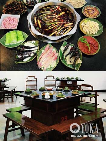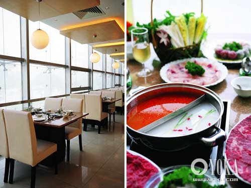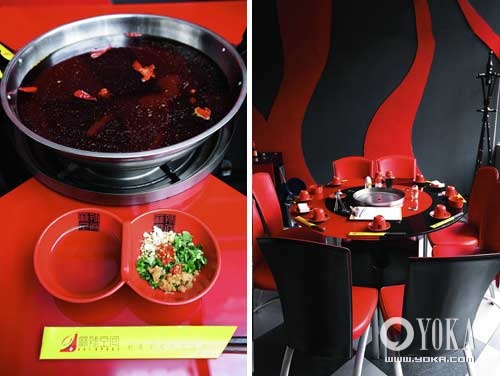 “空间”的大堂宽敞明亮,总体风格是很硬朗的红黑色调,年轻且个性化。这里最大的特色就是端上来的时候还只是放了少许红辣椒和姜片的“清汤”,但等到那最重要的主角——麻辣料包来了,就能摇身一变成了又麻又辣又香的麻辣火锅,而且锅底残渣甚少,吃起来很清爽!当家菜“春光盘脊丝”,上好的里脊肉切成条状,一圈一圈盘在盘子里,然后中间再放上一个生鸡蛋,顿时春光熠熠。吃的时候把蛋跟里脊肉条搅拌在一起,裹上蛋液的里脊肉怎么烫都依然鲜嫩,这里还有很特别的“恋爱碟”,一个原汤碟和一个香油碟紧密连接在一起,不过更推荐用原汤碟,用锅里的油代替香油,吃起来更麻更辣,更带劲。