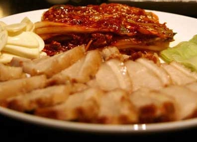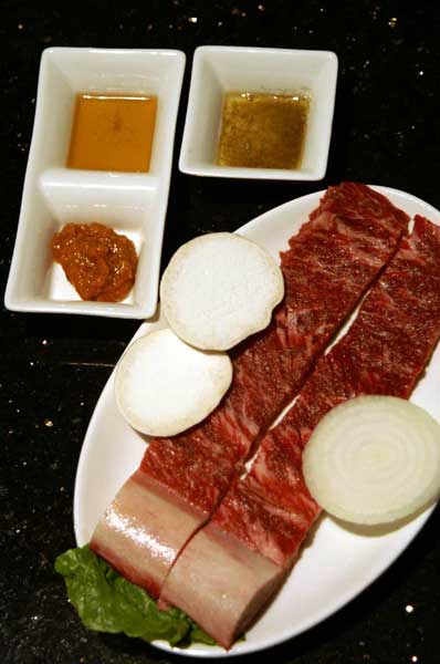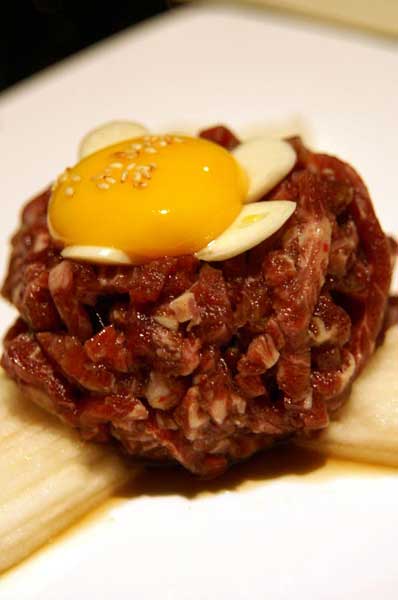 烤生牛排是韩国烤肉中的代表。肉质鲜嫩,烤之前不经过任何腌制,保持牛排的原汁原味。吃的时候要蘸上韩国料理特有的黄酱和香油,用生菜叶卷起来吃,牛排的肉香配上香油的油香,加上黄酱的咸和生菜的鲜,味道极为鲜美。