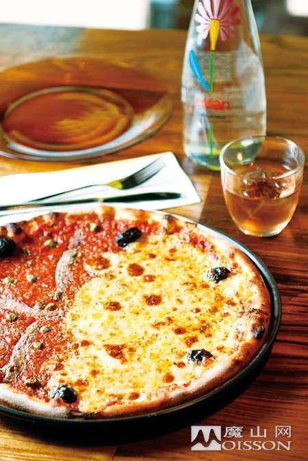 披萨一半是芝士味,另一半是银鱼柳配水瓜榴。先将面团拉成14寸的底后涂抹上番茄酱,然后再分开制作。芝士部分用的是法国芝士;另一半是银鱼柳配水瓜榴,全部馅料下好后,就放进披萨炉中烘烤。新鲜出炉的披萨搭配一杯餐前酒就更完美。