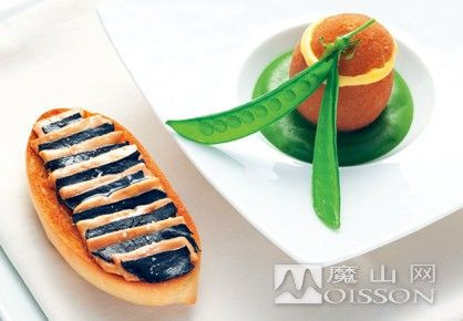 橙子冰淇淋配上略略烘烤过的面包,再铺上墨鱼片,外观就给人极大享受,轻轻品尝一口更是清新自然,让人尽享法式味道。