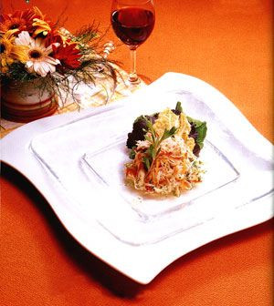 做法:将上述鲜花清洗干净,放到开水中稍煮一下,再用凉水过一下后捞出,装在盘子里摆好形状,拌入色拉酱即可。