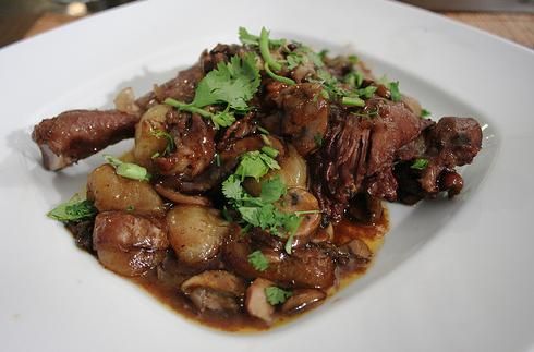 既然外号“高卢雄鸡”,法国人对鸡肉自然情有独钟。400多年前,法国波旁王朝的创建者,法皇亨利四世(Henri IV)就说过:“星期天每个农夫的锅里都必须有鸡”。红酒烩鸡的一般做法是将鸡肉配以洋葱和大蒜在黄油中煎炒,随后放入焖锅,加入红酒,并放在200度的烤箱里焖煮近1个小时(期间不时添加红酒,并加入蘑菇)后上盘。