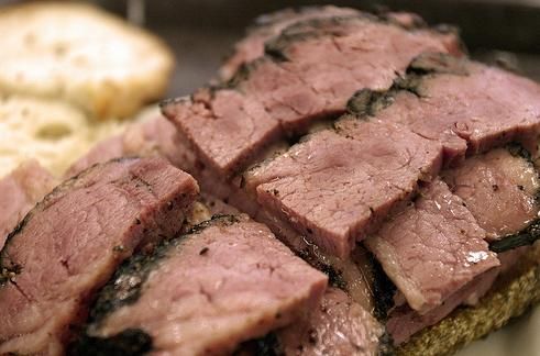 要举一个欧洲菜色中熏制菜肴的例子并不容易。种类实在太多(单单德国就有200种以上的熏肠),反而不知道讲哪一种好。刚好前两天听朋友讲起,去年必胜客在国内推出了帕斯雀熏肉(Pastrami)匹萨,还特意配上了一段关于拜占庭战士出征的美丽故事,那干脆就让我们聊聊它吧。“Pastrami”的词源有好几种说法。牛津英语辞典上说它来源于土耳其语的“bastirma”一词,意思是“压”。根据土耳其传说,当年的土耳其骑兵习惯把肉块垫在马鞍下,在骑马的过程中将水份轧出,以把肉保存更长的时间。而美国大辞典上说它来源于罗马尼亚语里的 “pastra”一词,意思就是“节省、保存”。还有词源学辞典说它来源于古希腊语的“pastos”,意思就是“腌”。