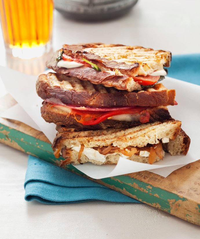 2 同时,组装帕尼尼:将4片面包放置在工作台面上,取两个成熟的蛋形番茄,去蒂,切片;170克新鲜马苏里拉奶酪切片;1/2杯市售鲜罗勒叶;1/8茶匙盐和1/4茶匙现磨黑胡椒。所有材料均匀分配在4片面包上。顶部放置剩下的面包