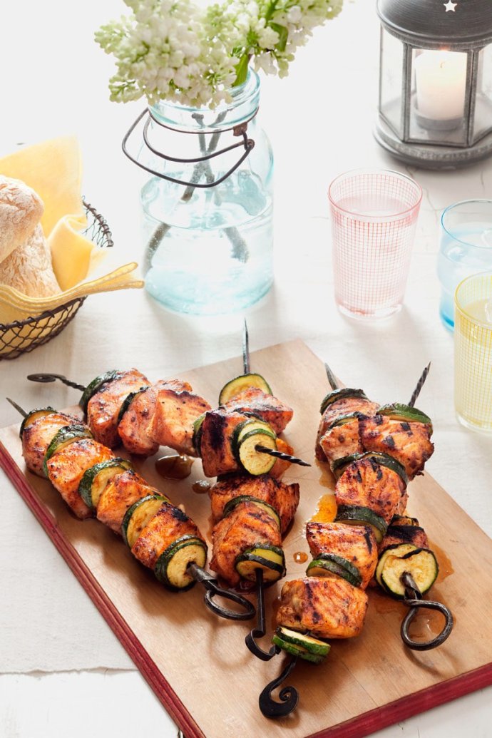 3 按照两片西葫芦,一块鱼肉的顺序穿成串。放在烤架上,烤制9到11分钟,直到鱼肉变得完全不透明,烤制过程中翻动几次。