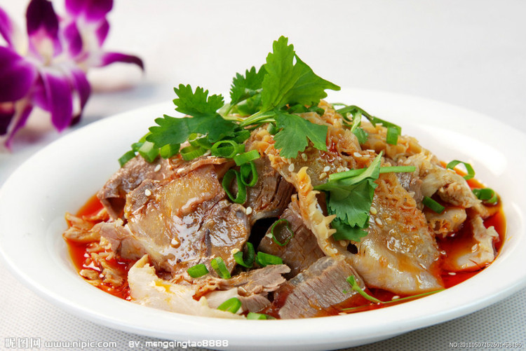 其中“灯影牛肉”制作方法与众不同,风味独特;是将牛后腿上的犍子肉切成薄片,撒上炒干水分的盐,裹成圆筒形晾干,平铺在钢丝架上,进烘炉烘干,再上蒸笼蒸后取出,切成小片复蒸透。最后下炒锅炒透,加入调料,起锅晾凉,淋上麻油才成。此菜呈半透明状,薄如纸,红艳艳,油光滑,放在灯下可将牛肉片的红影子映在纸上或墙上,好似演灯影戏。“夫妻肺片”是成都地区人人皆知的一道风味菜。相传本世纪30年代,有个叫郭朝华的小贩,和妻子制作凉拌牛肺片,串街走巷,提篮叫卖。人们谑称其为“夫妻肺片”,沿用至今。