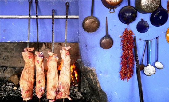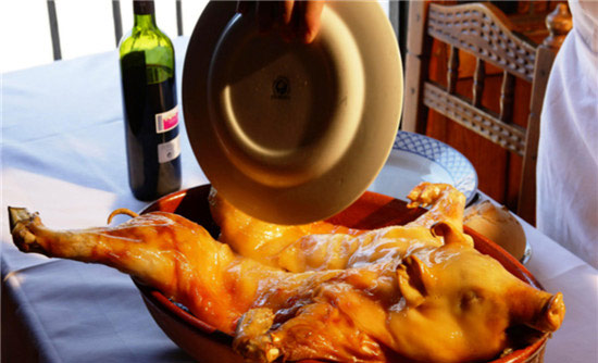 No.6 塞戈维亚,西班牙 西班牙中部,整个地区都以鲜美多汁的烤肉而闻名。在阿维拉,著名的有羔羊腿和牛脊肉,而风景迷人的中世纪城市塞戈维亚更以“烤全猪”吸引无数游人驻足品尝。烤制这道烤肉并不困难,一般会用一些百里香作调料,加上少许白葡萄酒。烤肉上桌后才会切割成片,肉质细腻,口感丰盛。