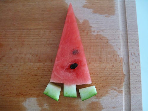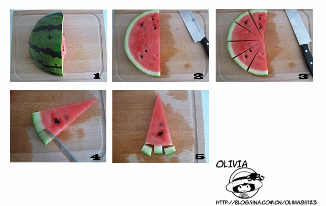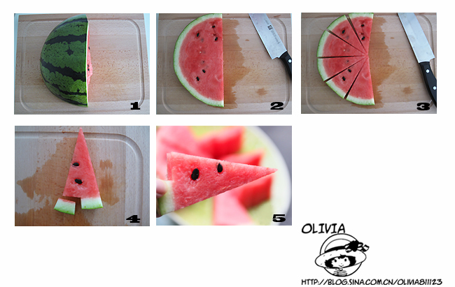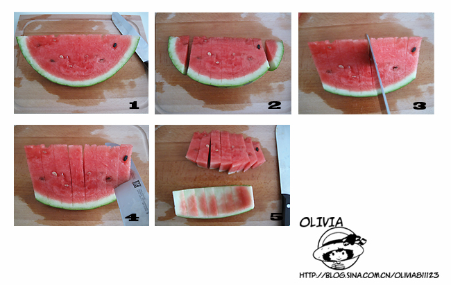 这个很方便,将西瓜切成1厘米左右厚度的片状,再沿底部切下即可。