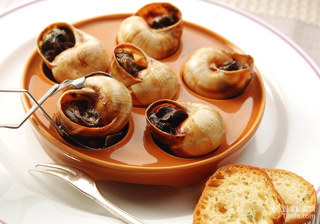 蜗牛和干贝、鲍鱼、鱼翅被称为法国四大名菜。法式蜗牛又是法国人的最爱,据统计,法国一年要消耗三亿多只蜗牛,法国人对蜗牛的喜爱从这数量上就可见一斑。而法国人做蜗牛菜又有不同的方法,如洋葱炒蜗牛、烩烧蜗牛、宫爆蜗牛、滑蛋蜗牛等等,最受多数法国人喜欢的还是这道法式焗蜗牛。