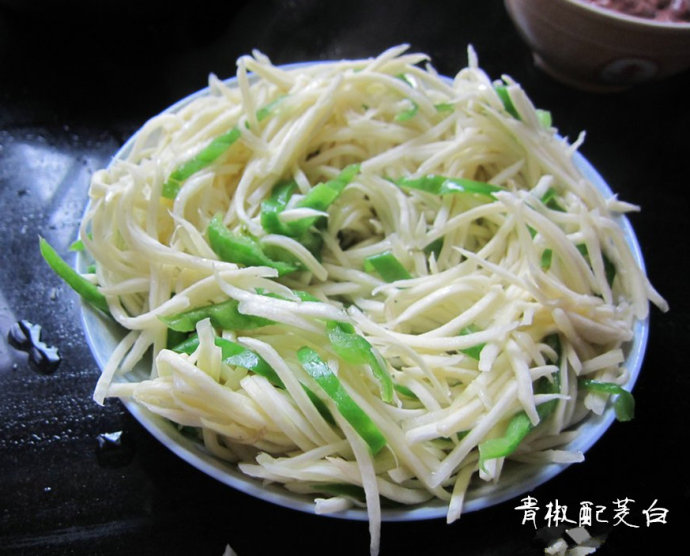 剥去茭白粗硬的外皮和根部,斜切成片。用油先把茭白丝炒软,加盐,最后放入青椒丝略炒就行了。
