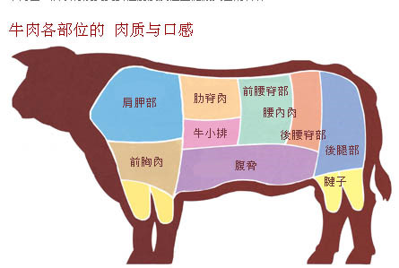 一只牛可区分为肩胛、肋脊、前胸、牛小排、前腰脊、后腰脊、后腿、腱子、腹胁等九大部位。而一般市面上所贩卖的牛肉,均是依据这九大部位细分而出。接下来就要告诉大家,哪些部位的肉适合做什么料理,让您在品尝鲜美牛肉时能吃得更地道!