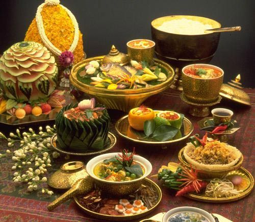 泰国的食物如同泰国文化一样,是众多影会下的综合产物,混合形成一种独特的菜肴。在“素可泰”时期和“大城”早期一般的菜肴是很简单的要是新鲜或干的鱼配上米、青菜,加上一些香料和由鱼露、虾酱所做成的咸佐料。其它的原料和味道则随着与外国文化的持续接触两增加;特别是“中国”及“印度”同时也受到欧洲的影响。今日的菜肴已形成非常多样的风貌,许多地区都有其特殊的名菜例如东北部以辛辣的食物著名南部则以有丰富的海鲜著称,回教食物的特色也出现在菜单中。