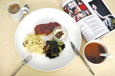 煮蛋的最高境界——让吃客们明知胆固醇高,一天以吃一颗鸡蛋为宜,却忍不住要去尝第二口,在这盘菜面前,我们都达到了。蛋黄不老不嫩,流出来又不至于满嘴一塌糊涂;蛋白爽滑干净,用叉子叉一口不软不硬。双黄蛋下面垫的是牛奶玉米片,高能量、低热量,既满足了早餐要喝牛奶的习惯,又迎合中餐要吃饱的古训。