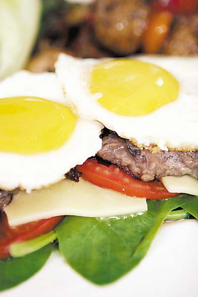 最底下是绿色蔬菜叶子,垫上薄薄一片芝士,上下各叠一块西红柿,两块7成熟的牛排就“孵”在上面,而略大一些的荷包蛋就把下面的风景全部遮盖住了。如果说前几道拼盘都让男生中觉得饱不了的话,那么这盘毫无疑问能满足所有人的胃口。