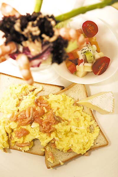 炒蛋配烟熏三文鱼、烤吐司、金文必芝士及水果酸奶色拉