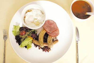 德国声名远扬的代表性美食非香肠莫属。目前,德国香肠的种类已达1500多种,而这次选用的香肠和火腿也是久已闻名。和火腿组合在一起的肉食大餐一点没有腻的感觉,而且还对旁边的煮鸡蛋虎视眈眈。