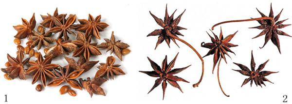 【1. 大茴香(Illicium verum),八角科Illiciaceae 八角属Illicium,乔木,八角果实是厨房里最常见的调料之一。2. 同属于八角属,但这货却是“山寨”八角的毒物莽草,其果实多为八至十三瓣,角顶端呈尖钩状。】