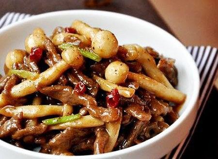 5、等锅热了以后放入豆油,将准备好的牛肉、蕨菜、桔梗、蘑菇按顺序放进去炒。
