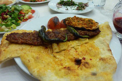 你还在苦苦寻觅一个烤肉大城吗?或许土耳其南部的亚达那城正是您的魂牵梦绕之地。亚达那城香辣羊羔肉名扬四方,其做法是将烤肉穿在铁签子上,放在橡木架上烧烤。待烤熟后,将其盛在大饼上,这样大饼可以充分吸收烤肉流出的鲜美肉汁。另外,还有烤熟的西红柿与辣椒以及洋葱沙拉、欧芹等与之搭配,味道更加香辣可口。地道的吃法是用餐叉将西红柿与辣椒捣碎,抹在饼上,裹上些许烤肉,在上面放些洋葱沙拉卷起来,肉质细嫩、油酥爽口,常常使顾客胃口大开、狼吞虎咽。