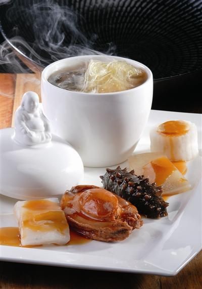 品:所费材料皆为鱼翅、鲍鱼、海参、鸽蛋等,所以胶原蛋白特别丰富,汤汁入口很滑,有黏稠感。