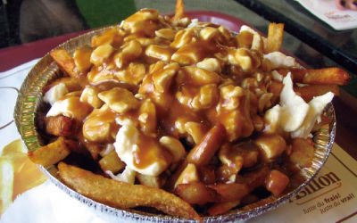 注:奶酪浇肉汁马铃薯条(Poutine),是加拿大魁北克特有的小吃之一,原料有油炸马铃薯条,颗粒型奶酪块以及肉汁,有时候还会加入火腿,香肠或者鲑鱼。通常用作配餐。
