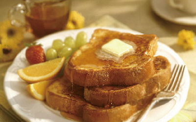 注:法国吐司(英语:French toast,法语:Pain perdu,全称法兰西多士,台湾称法国吐司)是北美洲及欧洲部份地区常见的早餐食品,起源于法国,为加入蛋汁油煎的吐司,通常佐以牛油及糖浆食用,两片面包中间常涂有花生酱或果酱。