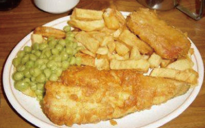 注:炸鱼薯条(英语:Fish and chips)源自英国,是将去骨的鱼,切成片后裹上湿面团,然后油炸制成炸鱼,同时也炸薯条,吃的时候还会配上不同口味的调味酱,算是种很普遍的街边小吃。在新西兰和澳洲也很受欢迎。在美国,这种炸鱼薯条也渐渐地普遍起来。几十年来,炸鱼薯条是英国盛行的外带食品之一。