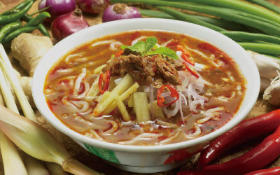 注:亚参叻沙(Assam laksa)[闽南语:a-sam lat-sa], 亚参叻沙就是用鱼熬出来、略带酸味的浓汤。 Assam是酸豆的马来词,经常用来带出汤料的酸味。 亚参叻沙的用料包括切碎的鲭鱼丝,黄瓜、葱、红辣椒、菠萝、生菜、一般薄菏、叻沙薄菏。亚参叻沙通常配以米线或米粉上碟. 并且冠上“petis udang”或“虾膏 ”,浓的虾味甜酱,非常美味。