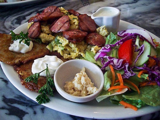 波兰早餐当地人成为Jajecznica,这种传统的波兰早餐包括覆盖有客人自己选择的波兰熏肠切片的炒鸡蛋,同时搭配有两个土豆煎饼。