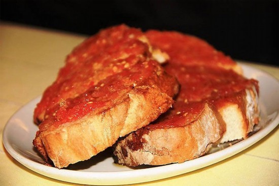 西班牙早餐Pan a la Catalana或者是Pan con Tomate(一种面包),西班牙的早餐一般很简单,但是却很美味。就是把新鲜的大蒜和成熟的番茄酱擦在面包上,然后加少许橄榄油和盐。